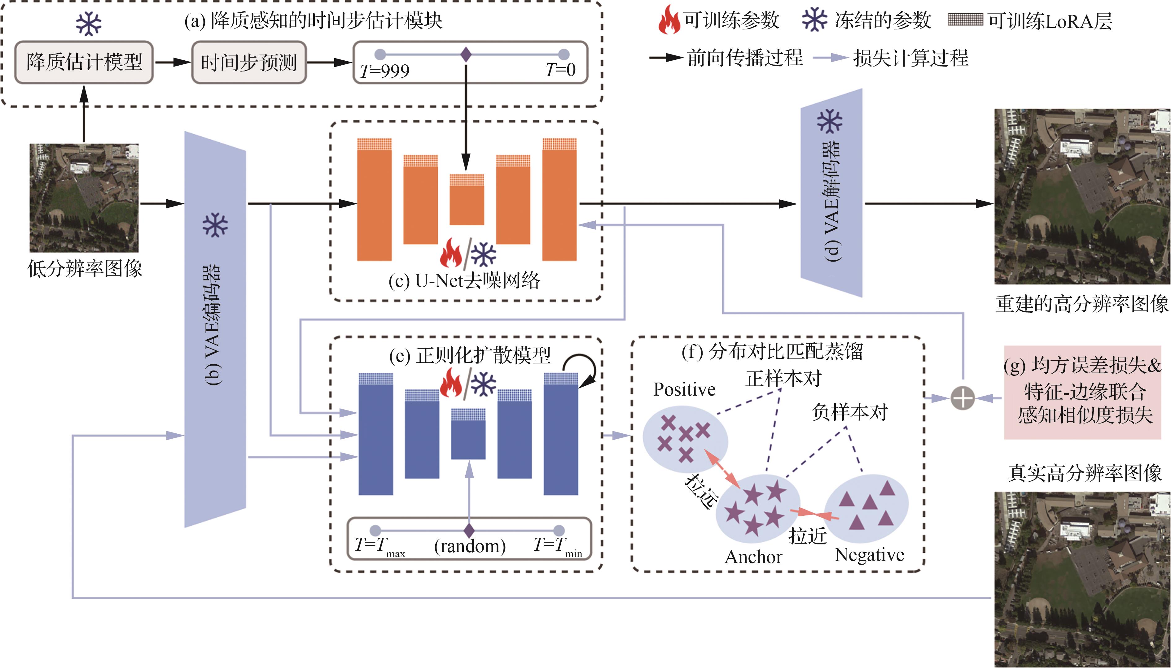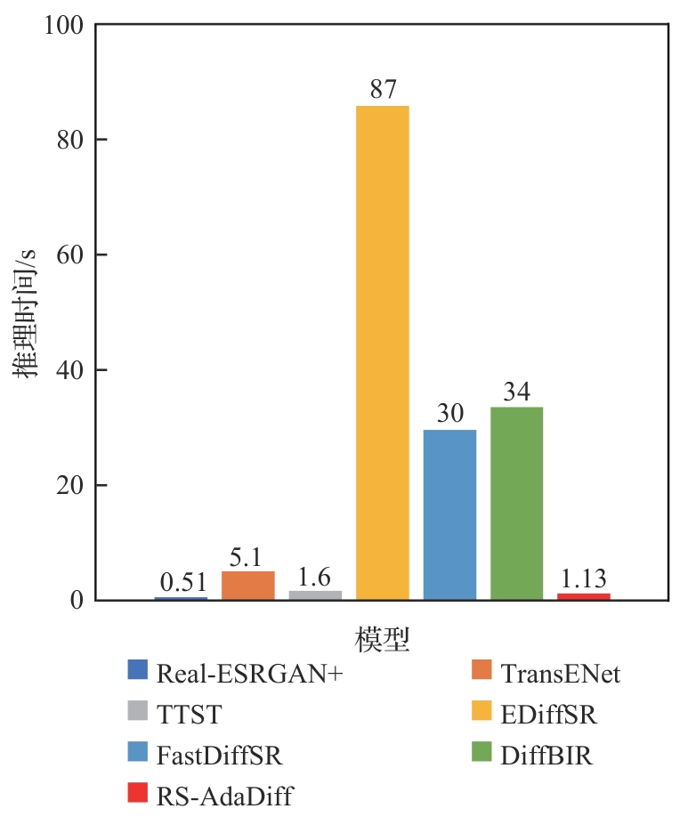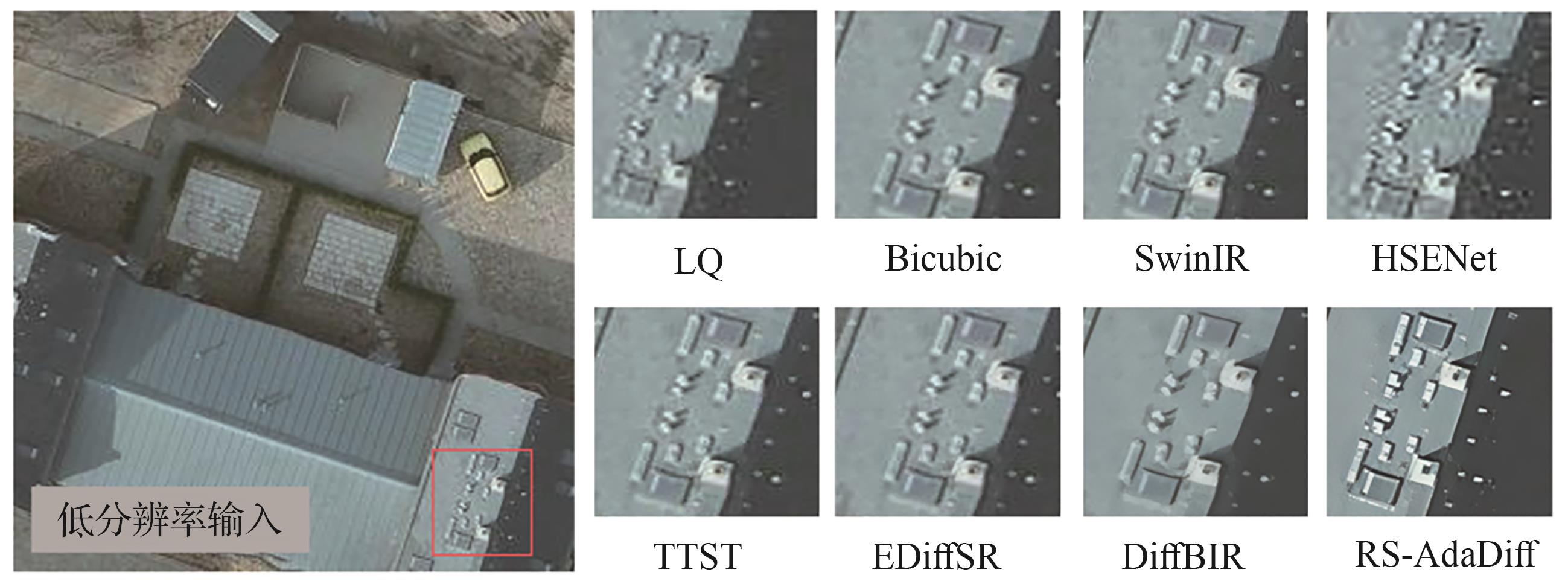 扩散模型在生成逼真图像细节方面展现出巨大潜力。然而,现有的扩散模型主要基于自然图像进行训练,将这些模型应用于遥感图像超分辨率任务仍然面临巨大挑战。此外,这些模型在推理时需要数十或上百次的迭代采样,导致计算成本高昂,并限制了它们在实际应用中的适用性。为此,提出一种基于降质感知自适应估计的单步遥感图像超分辨率扩散模型(RS-AdaDiff),兼顾重建性能与推理效率。具体而言,提出了一个基于降质感知的时间步估计模块,可通过估计输入图像退化程度的扩散模型自适应估计扩散时间步,从而将迭代去噪过程重构为从低分辨率到高分辨率图像的单步重建过程,大幅加快推理速度。同时,将可训练的轻量LoRA网络层集成到预先训练的扩散模型中,并利用遥感图像数据集对其进行微调,以消除数据分布差异造成的领域差距问题。此外,为了充分利用预训练模型的图像先验,引入了分布对比匹配蒸馏。通过KL散度正则化,使重建的超分图像在特征空间中更接近高分辨率图像并远离低分辨率图像,从而提升生成质量。最后,还提出特征-边缘联合感知相似度损失,以增强结构信息的感知能力,改善边缘模糊和纹理失真问题。大量实验结果表明:提出的RS-AdaDiff在多个公开遥感数据集上均优于现有先进方法,在定量指标和视觉质量方面均取得显著提升,能够生成结构清晰、细节丰富的超分辨率遥感图像。
