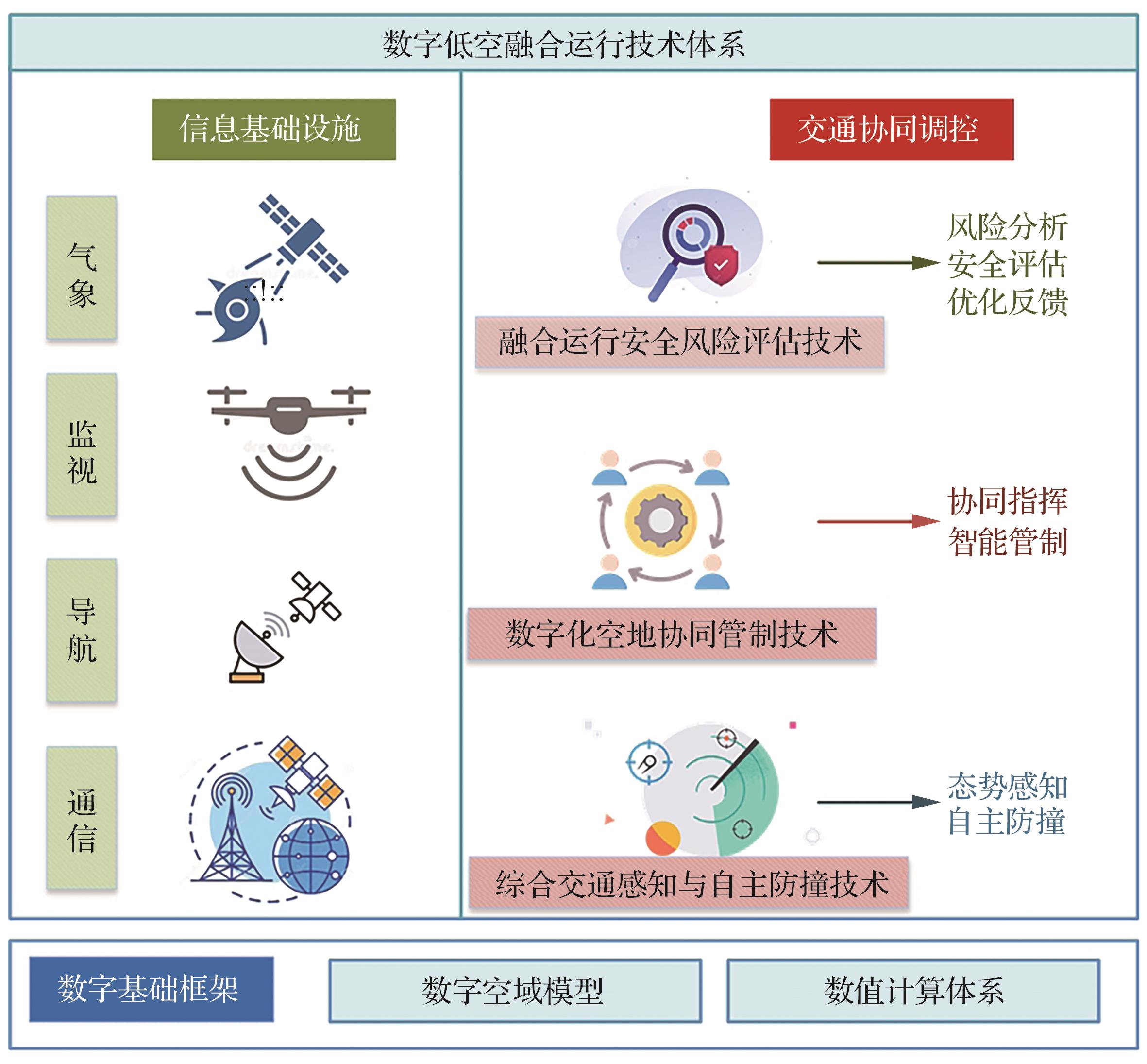 数字低空通过在信息空间内数字化重构物理飞行空域,形成数字低空基础框架,将面向对象的传统空域管理模式转化为面向空域资源的计算与优化问题,充分发挥空域空间不变性优势,降低大规模异构对象管控业务的复杂度。在此基础上,还需建立从信息获取与处理的基础设施到人、机、域交通协同调控的业务逻辑的完整技术体系,支撑低空空域安全高效运行。首先梳理了低空空管的数字化发展趋势;其次介绍了为低空空管提供核心数据的信息基础设施;再基于空域数字基础框架论述了融合运行的关键技术难点,为安全高效的数字低空融合运行技术体系构建研提出可行技术路径;最后提出了数字低空空管的发展建议,为未来数字低空空中交通管理能力的升级和相关学科的发展提供了参考,以期保障低空融合运行安全有序、促进低空经济健康发展。