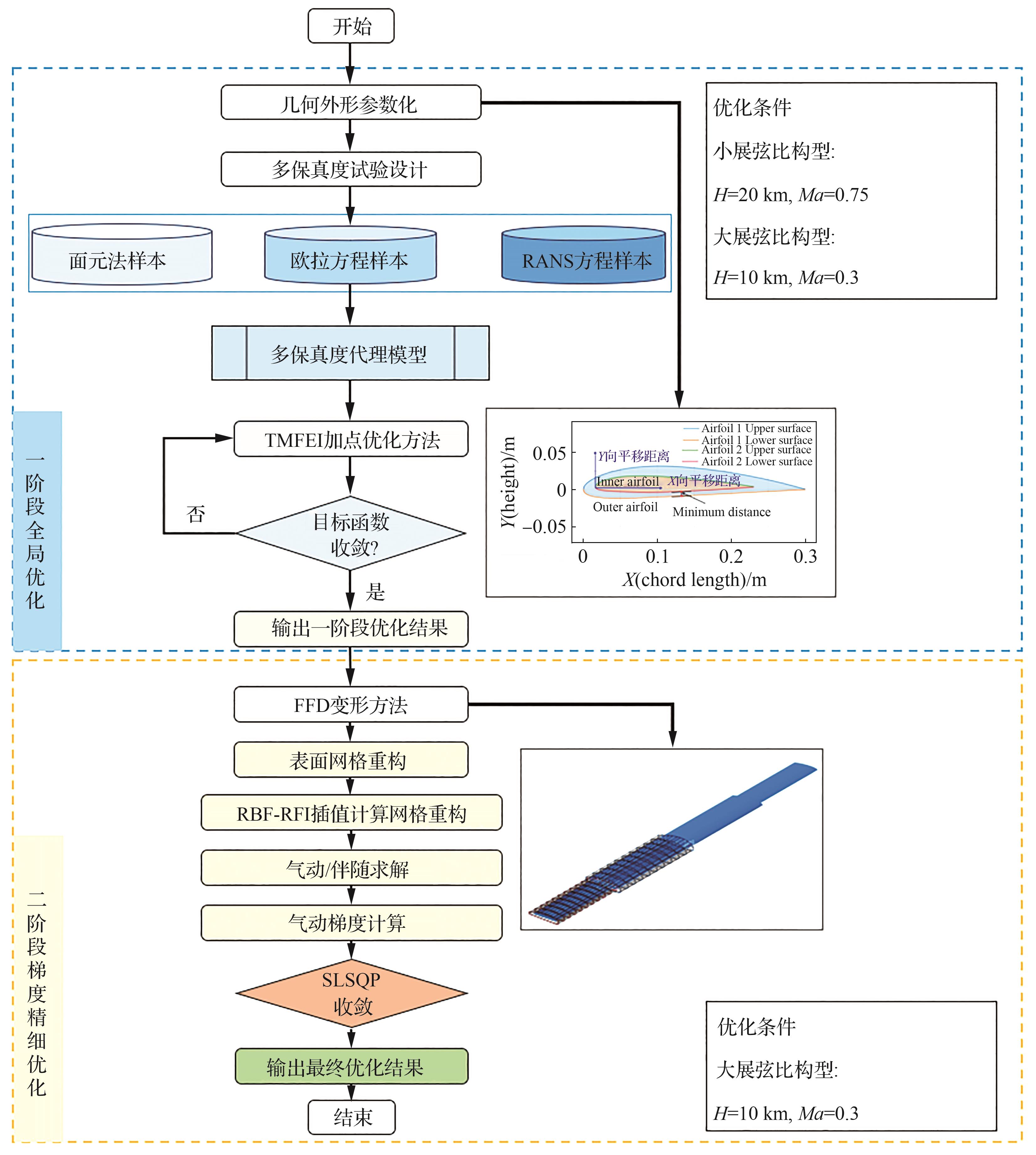 针对上述挑战,本文聚焦于解决跨速域飞行器多状态气动需求矛盾与总体设计耦合难题,提出乘波体组合旋转伸缩翼的跨速域变体飞行器总体设计及任务性能评估框架。针对该飞行器的任务特点和多阶段变体特征,开展了该类飞行器的总体参数可行性评估方法研究,建立了基于多阶段再入飞行走廊约束的跨速域变体飞行器总体参数评估方法。在确定了飞行器的总体参数和布局后,本文开展了高超声速乘波体整流罩的宽速域优化和亚声速变体机翼的气动优化。形成满足多阶段飞行约束的优化方案,为该布局的进一步发展奠定了基础。