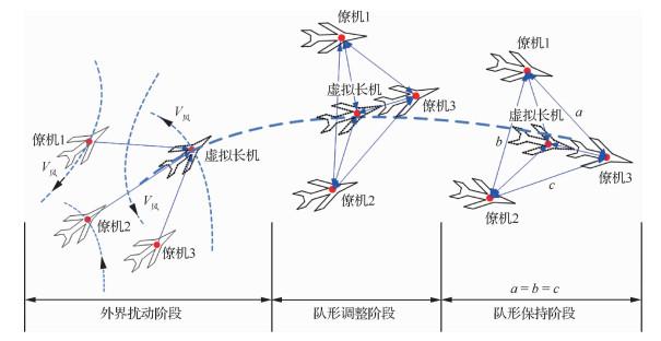 1 问题描述假定有N(N>20)架固定翼无人机组成一个正多边形的多无人机编队,其中有一架虚拟长机位于正多边形的几何中心,其余N-1架无人机位于多边形的顶点处。每架无人机从不同起点起飞,追踪虚拟长机,并迅速集合编队,然后保持既定的队形编队飞行。在该过程中,建立恰当的无人机运动模型是控制无人机编队队形的关键因素之一,能够准确描述无人机之间的通信关系。多无人机编队从松散队形到预设队形直到队形保持过程中,历经外界扰动阶段,队形调整阶段以及队形保持阶段,如图 1所示。
