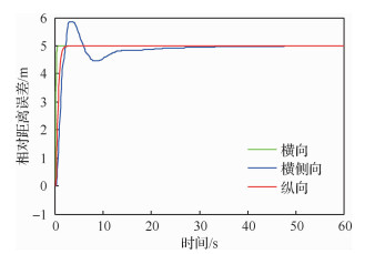 图 10为无人机编队相对运动曲线图。随着时间的变化,该曲线呈现一种先迅速增大,之后缓慢减小直至稳态趋势。在集结编队之前,4架无人机的初始速度不同,他们在刚开始2 s相对距离增大;由于虚拟长机的速度最大,其他3架无人机在横向提前达到稳定状态,而横侧向稍有延迟,但最终实现期望的队形。