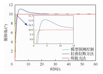 图 15为无人机编队俯仰角速率曲线图。由图 15可知,模型预测控制方法、拉普拉斯方法以及所提方法的俯仰角速率变化量分别是10、7和3(°)/s,稳态所需时间分别为1、10和3 s。模型预测控制方法使无人机收敛稳态所需时间最短,但俯仰角速率变化最大;拉普拉斯方法使无人机俯仰角速率变化最小,但收敛所需时间最长;所提方法使无人机俯仰角速率变化较小且收敛时间较短,有利于地面人员操控。
