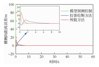 图 14为无人机编队横侧向距离误差曲线图。随着时间的变化,该曲线呈现一种小幅度振荡后趋于稳态的趋势。3种控制方法均能使无人机收敛期望的队形,但需要时间不同。模型预测方法所需的时间较短,无人机之间的横侧向距离误差最大且收敛时间也是最小的,但是集结期望队形所需的时间很长;拉普拉斯方法横侧向距离误差最小,但是所需时间是最长的;所提方法所需时间和相对距离误差均较小,是比较理想的队形控制方法。