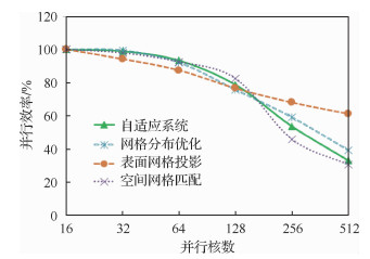 | 图 10 自适应系统和3个模块的并行效率 Fig. 10 Parallel efficiency of adaption system andits three kernel modules |