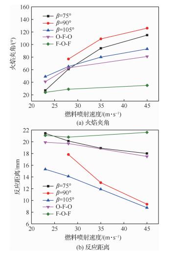 3) 凝胶MMH/NTO推进剂稳态燃烧时的火焰夹角随燃料射流速度增大而增大,燃料射流速度相同时,撞击角为90°的两股互击式喷嘴火焰夹角最大,F-O-F形式的三股互击式喷嘴火焰夹角最小。而反应距离随燃料射流速度增大而减小,燃料射流速度相同时,F-O-F形式的三股互击式喷嘴反应距离最大,撞击角为105°的两股互击式喷嘴反应距离最小。