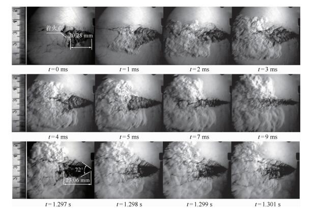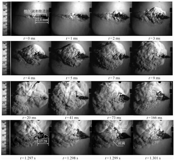 图 5 采用三股互击式喷嘴时凝胶MMH/NTO推进剂燃烧过程纹影图像( |