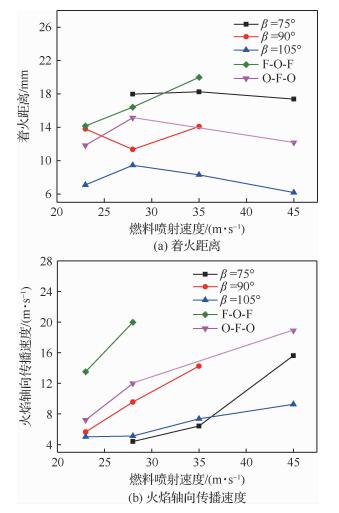 图 7(b)给出不同工况下凝胶MMH/NTO推进剂着火过程火焰轴向传播速度与燃料喷射速度的关系曲线。从图中可以看出,保持混合比不变,着火过程火焰轴向传播速度随燃料射流速度增加而增加,但火焰轴向传播速度远低于燃料喷射速度,其最低只有4 m/s左右,最高亦只有20 m/s。而燃料射流速度最低亦有23 m/s,氧化剂速度更高。同时不同撞击角下火焰轴向传播速度亦存在差异,总体而言,撞击角为90°时火焰轴向传播速度快于撞击角为75°和105°时的火焰轴向传播速度,其中F-O-F形式三股互击式喷嘴火焰轴向传播速度最快,O-F-O形式次之,90°两股互击式喷嘴最小。主要原因是火焰产生于燃料和氧化剂为化学计量值的位置上,撞击角为75°时推进剂雾化、混合和燃烧较差[22],相同的区域需要更长的时间组织燃烧,撞击角为105°时虽然不存在这样的问题,但撞击角过大,撞击横向动量分量较大,影响了推进剂轴向运动速度,自然导致火焰轴向传播速度降低。而三股互击式喷嘴则因为中间路推进剂直接沿喷注面轴向喷出,相对而言推进剂轴向运动速度较大,特别是F-O-F喷嘴,较难雾化的燃料从两侧喷出后,氧化剂才从中路以更高速度喷出,促使氧化剂和燃料在下游以更快速度混和并达到燃烧条件,火焰传播速度最快。