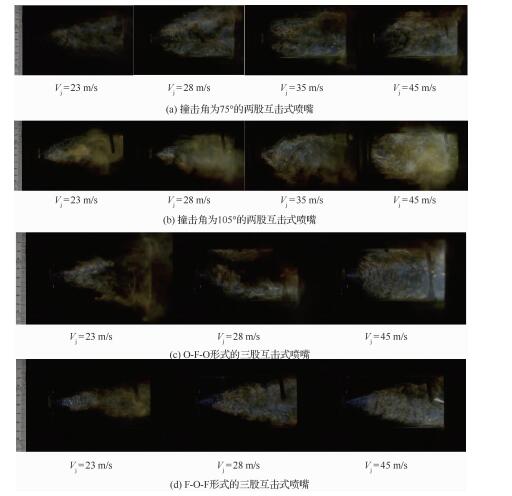 2.2.2 稳态燃烧过程图 8给出了凝胶MMH/NTO推进剂稳态燃烧时火焰的自然辐射发光图像,从图中可以看出,不同喷嘴的火焰形态及亮度均存在差异,当撞击角为75°时,火焰整体较暗淡,空间分布不连续,中间夹杂白色液雾,说明推进剂混合燃烧不充分。同时在火焰边缘明显观测到四氧化二氮高温下分解产生的NO2烟雾。当撞击角为105°时,可以看出此时火焰颜色与撞击角为75°时不同,火焰呈浅黄色,火焰相对亮度更高,空间分布更均匀,一定程度上说明此时推进剂混合燃烧更充分。当采用O-F-O形式三股互击式喷嘴时,火焰亮度与采用撞击角为75°的两股互击式喷嘴时相似,但射流速度Vj=23,28 m/s时火焰亮度空间分布不均匀更明显,火焰内部存在大片区域未观察到火焰自然辐射发光,火焰尾部主要是NO2烟雾,传感器探头下方也积聚了大量液体推进剂,说明推进剂混合燃烧较差。而采用F-O-F形式三股互击式喷嘴时,火焰亮度与O-F-O形式三股互击式喷嘴时类似,但火焰更加细长,分布也比较均匀。