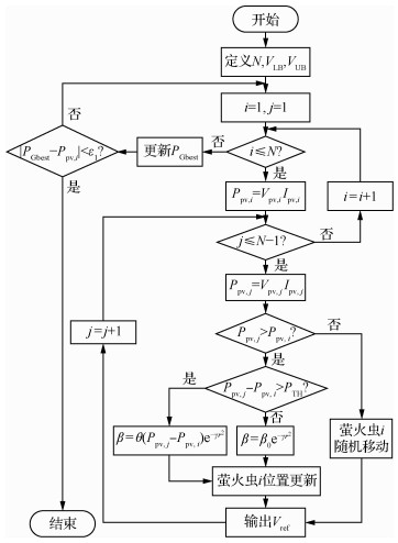 基于MFA的最大功率点追踪控制流程如图 1所示,图中Ipv, i为各个萤火虫实际电流。