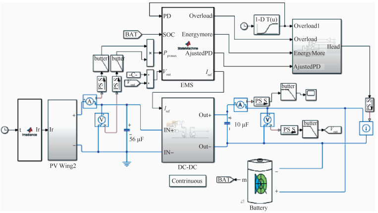 “蒲公英Ⅰ”无人机采用左右对称的双能源动力系统架构,本文以其右侧混合能源动力系统为原型,基于3.2.1节MPPT仿真模型,加入飞行任务剖面需求功率,建立混合能源管理系统仿真模型,如图 15所示。本文采用容量为2.6 Ah的6S锂聚合物电池,参数取值如表 5所示。