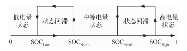 为了避免蓄电池出现局部状态陷阱、保证状态间的平滑过渡,在蓄电池电量状态临界点加入状态回滞环[23](见图 2),在SOC临界值附近增加状态回滞区域,在该区域内保持上一电量状态,进而解决局部状态反复跳变问题。