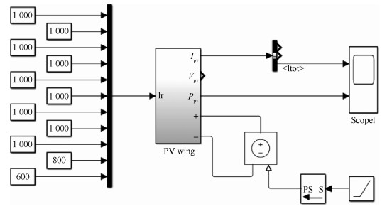 本文以右太阳能电池阵列为例,建立太阳能电池阵列模型。其中:太阳能电池沿机翼弦向串联;相邻两串并联,同时并联一个旁路二极管,构成一个太阳能电池阵列单元;靠近翼根的单元记为PV1,由内向外进行编号,共计11个单元串联在一起形成太阳能电池阵列。每个电池单元视为均匀光照,可通过改变不同单元的光照强度来模拟局部阴影情况。图 5为电池阵列仿真模型。