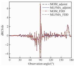 采用基于HMQ全局径向基函数的域元法[28-29]对双椎体模型进行参数化,设计变量分布如图 4所示。采用基于矩量法、多层快速多极子算法的伴随方法和基于矩量法的有限差分法求解各设计变量在Z方向的梯度,认为基于矩量法的有限差分(FDD)结果为梯度的精确解。有限差分计算中扰动量Δx=10-3 m。设计变量A和B(见图 4)在各入射角度的导数计算结果如图 5和图 6所示。