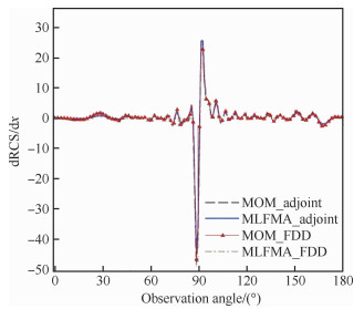 伴随方程的形式与正计算(RCS评估)的形式一致,可以直接采用正计算采用的数值方法(矩量法、多层快速多极子算法)求解。将式(23)代入式(20),基于伴随方法的目标梯度可以写为