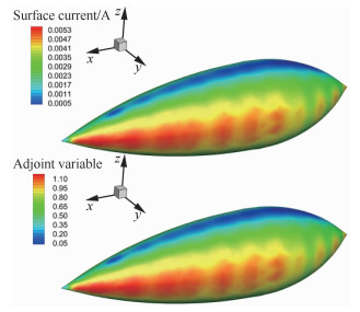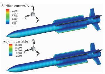 | 图 12 导弹感应电流及伴随变量云图 Fig. 12 Contours of surface current and adjoint variable of missile |