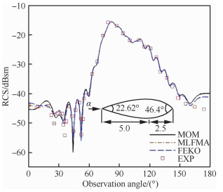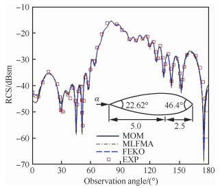 3.1 双椎体模型双椎体模型长7.5 in(1 in=25.4 mm),由2个椎角分别为22.62°和46.4°的半椎拼接而成[26-27],是EMCC(ElectroMagnetic Code Consortium)[27]提供用于校验计算电磁学代码的标准算例之一。双椎体模型两端存在尖点,高频方法难以准确计算,需采用高精度数值求解方法。计算采用的雷达波频率f=9 GHz,单站散射水平极化和垂直极化,网格平均尺寸约为λ/10,未知量总数e=11 094。采用矩量法、多层快速多极子算法计算,并用商用软件和实验值(EXP)[26-27]校核计算结果。几种算法的计算结果如图 2和图 3所示。本文采用的矩量法和多层快速多极子算法均与实验值及商用软件FEKO矩量法的计算结果吻合良好,具有较高精度。