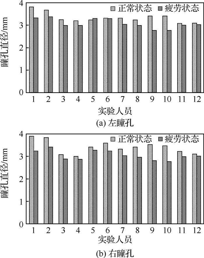 图 4给出了实验人员的左右瞳孔在不同工作状态下的瞳孔直径的均值,从图中可以看出,疲劳状态下,瞳孔直径变小。分别计算不同工作状态下,左右瞳孔直径的差异值的均值。其中,实验人员正常和疲劳状态下左瞳孔直径差异值的均值为0.276 mm,右瞳孔为0.367 mm,每个实验人员的不同工作状态下,瞳孔直径的差异情况如图 5所示。瞳孔直径差异值的均值和图 5的数据表明不同工作状态下右瞳孔直径差异更大。为了排除非疲劳因素导致这一现象,通过视频回放整个实验过程,所有有效数据的实验人员的光照强度和角度没有明显差异,注视方向也都集中在待检查区域范围。同时统计每个实验人员的视力情况,发现右眼视力均优于左眼,由此推断目视检查中,由于左右眼视力差异,导致检查更依赖右眼,因此右眼受疲劳的影响更大。