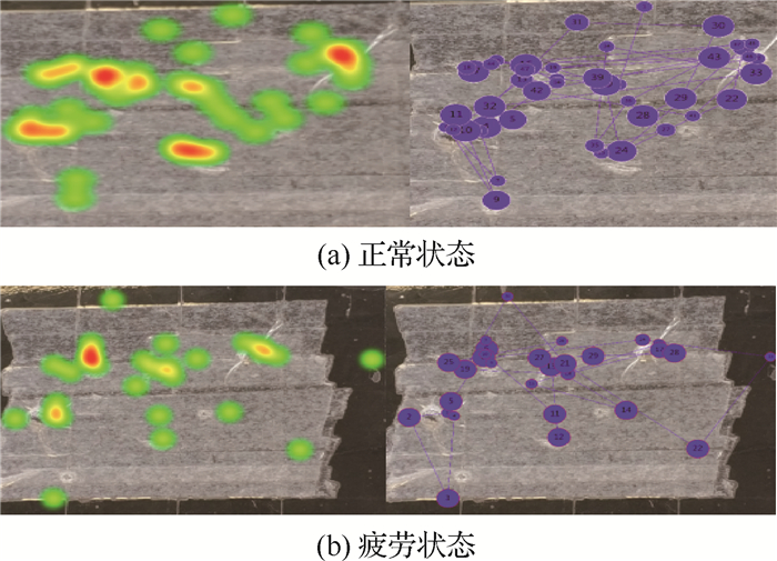 1) 采用民机复合材料结构目视检查实验,对正常状态和疲劳状态下的眼动数据进行采集与分析,疲劳状态下的任务持续时间、注视次数、注视总时间、眼跳次数和眼跳总时间数据均值都高于正常状态,瞳孔直径和扫视速度小于正常状态。两种状态下的注视热点与轨迹差异明显。
