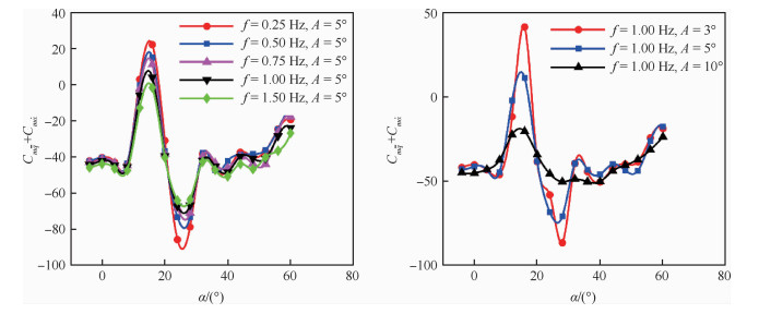 | 图 3 不同频率、振幅俯仰阻尼导数 Fig. 3 Longitudinal dynamic stability derivatives for different frequencies and amplitudes |