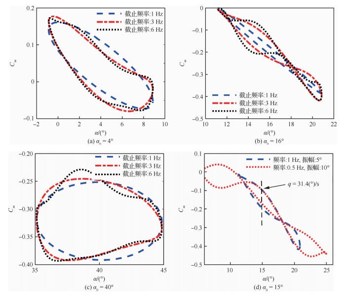 图 4中分别给出小迎角(α0=4°)、中大迎角(α0=16°)、大迎角(α0=40°)下,以振荡频率f=1 Hz、振幅A=5°开展动导数试验时,绘制的俯仰力矩系数Cm关于迎角的迟滞回线,图中不同“截止频率”指的是数据处理时的滤波截止频率。例如,截止频率为1 Hz(与强迫振荡频率相同,即通常说的保留1阶量),即认为绕流流场变化频率与飞机刚体运动频率一致,迟滞回线为标准椭圆。众所周知,基于小扰动线性化假设的动导数就是由该1阶量计算得到的。可以看出,在常规小迎角范围或者在迎角特别大时,保留到高阶量(如6阶)与只留1阶量相比迟滞回线是比较接近的,即表示此时用动导数就可以比较准确地描述飞机的动态气动力,俯仰力矩随俯仰角速度是接近线性变化的;但是,如图 4(b)所示,在该中大迎角范围时,气动力存在明显的高阶量,因此,俯仰力矩随俯仰角速度变化有明显的非线性特征,此时,常规的线化导数不能精确反映动态气动力特性。从对气动力的频谱分析也可以看出,对应的数据含有1~6阶量(7阶以上基本没有),一方面说明了该区域动态气动力存在显著非线性,另一方面该结果也表明对于气动力迟滞回线的计算,保留到6阶(当强迫振荡频率为1 Hz时,截止频率为6 Hz)是比较合理的。