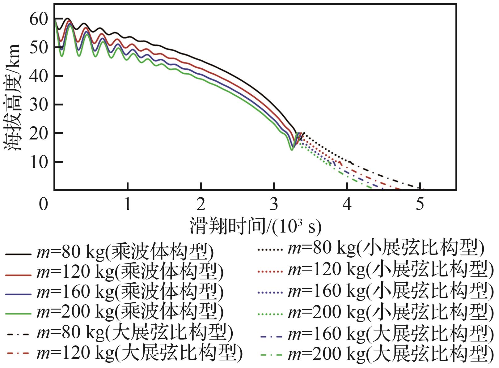 | 总质量/kg | 乘波体构型滑翔时间/s | 小展弦比构型滑翔时间/s | 大展弦比构型滑翔时间/s | 亚声速总滑翔时间/s | 终点经度/(°) |