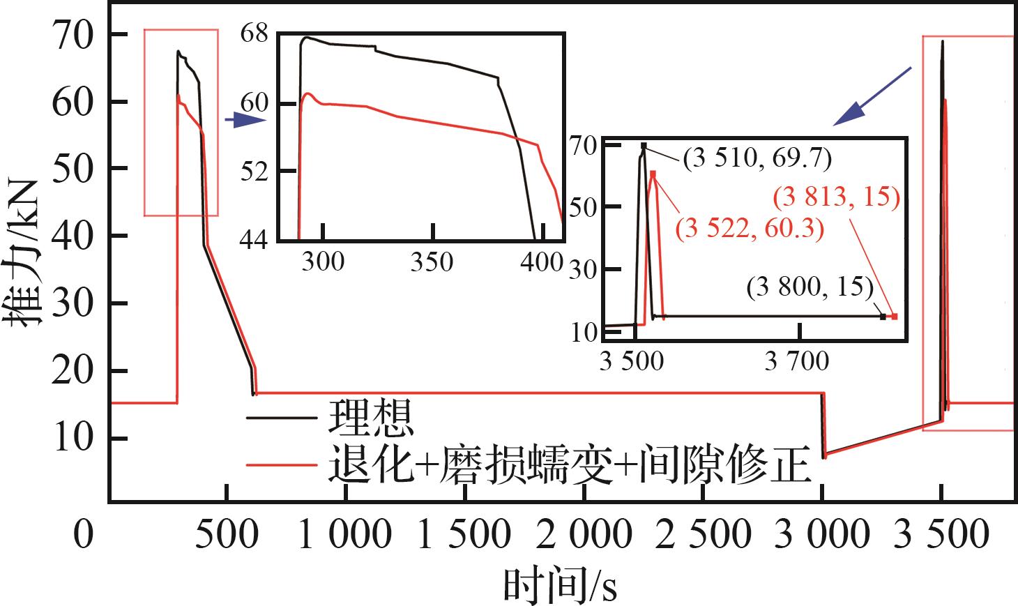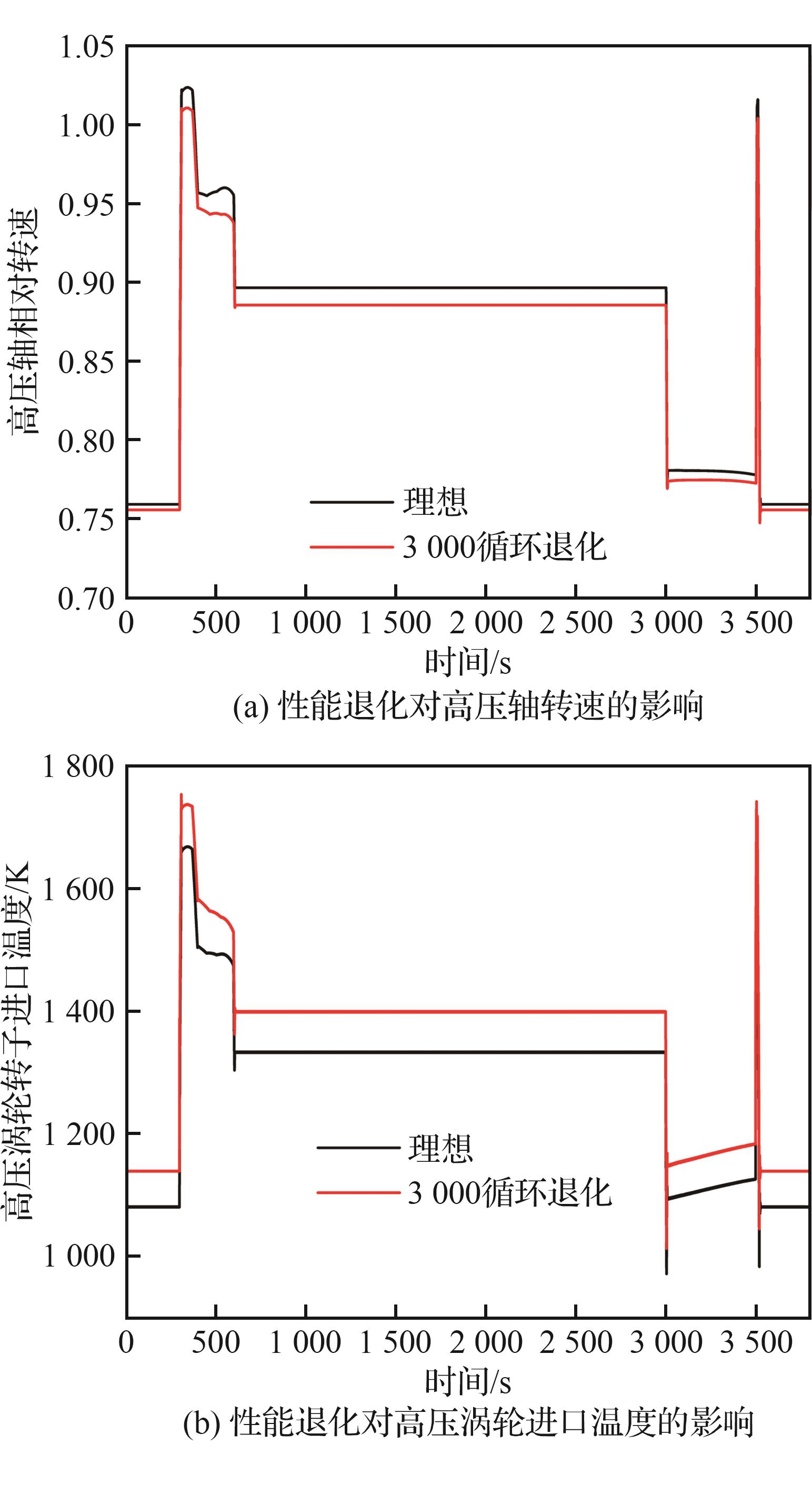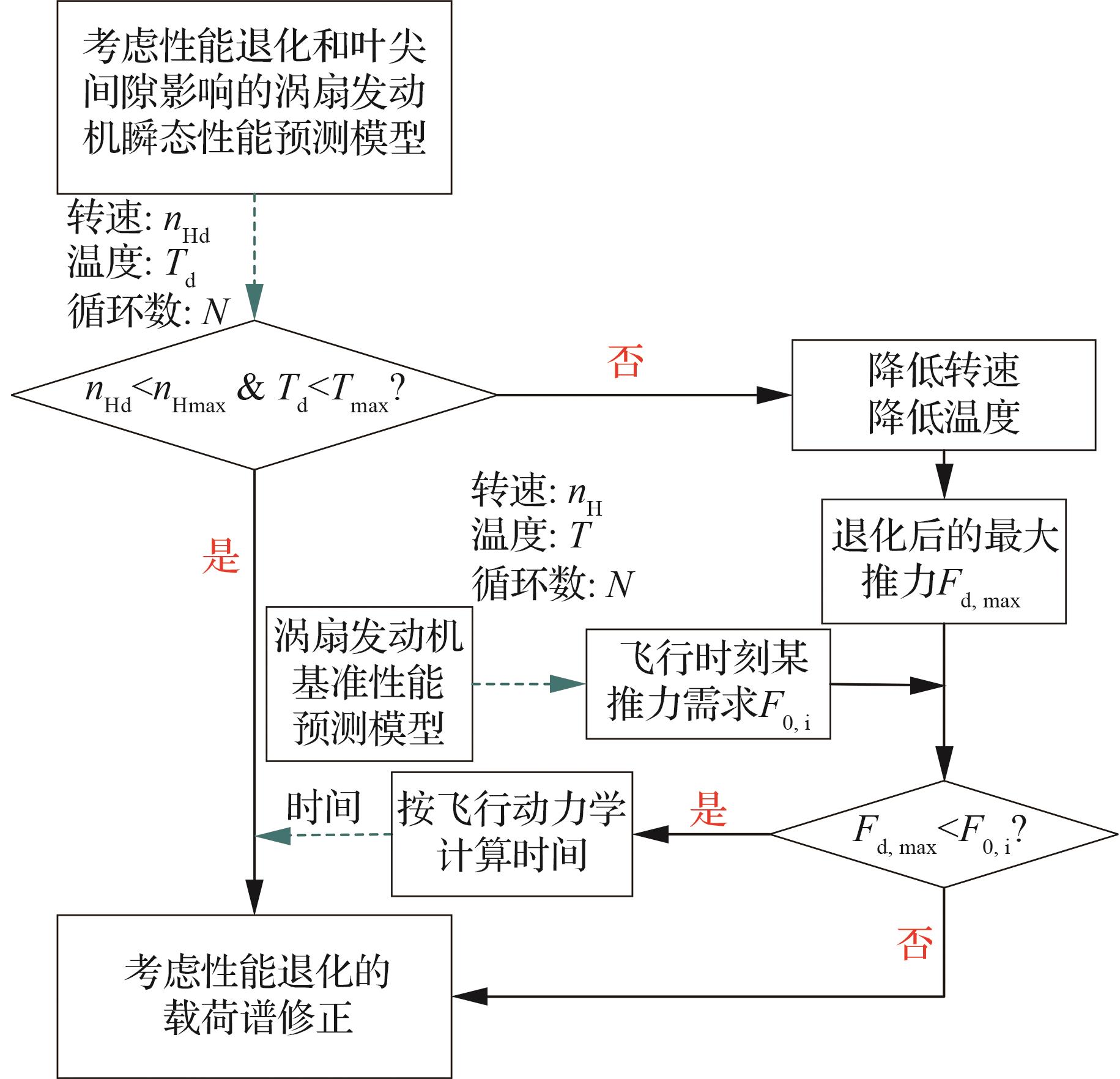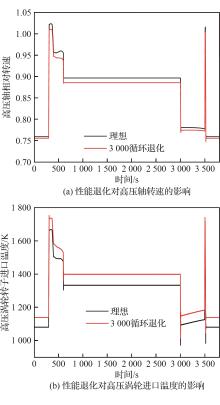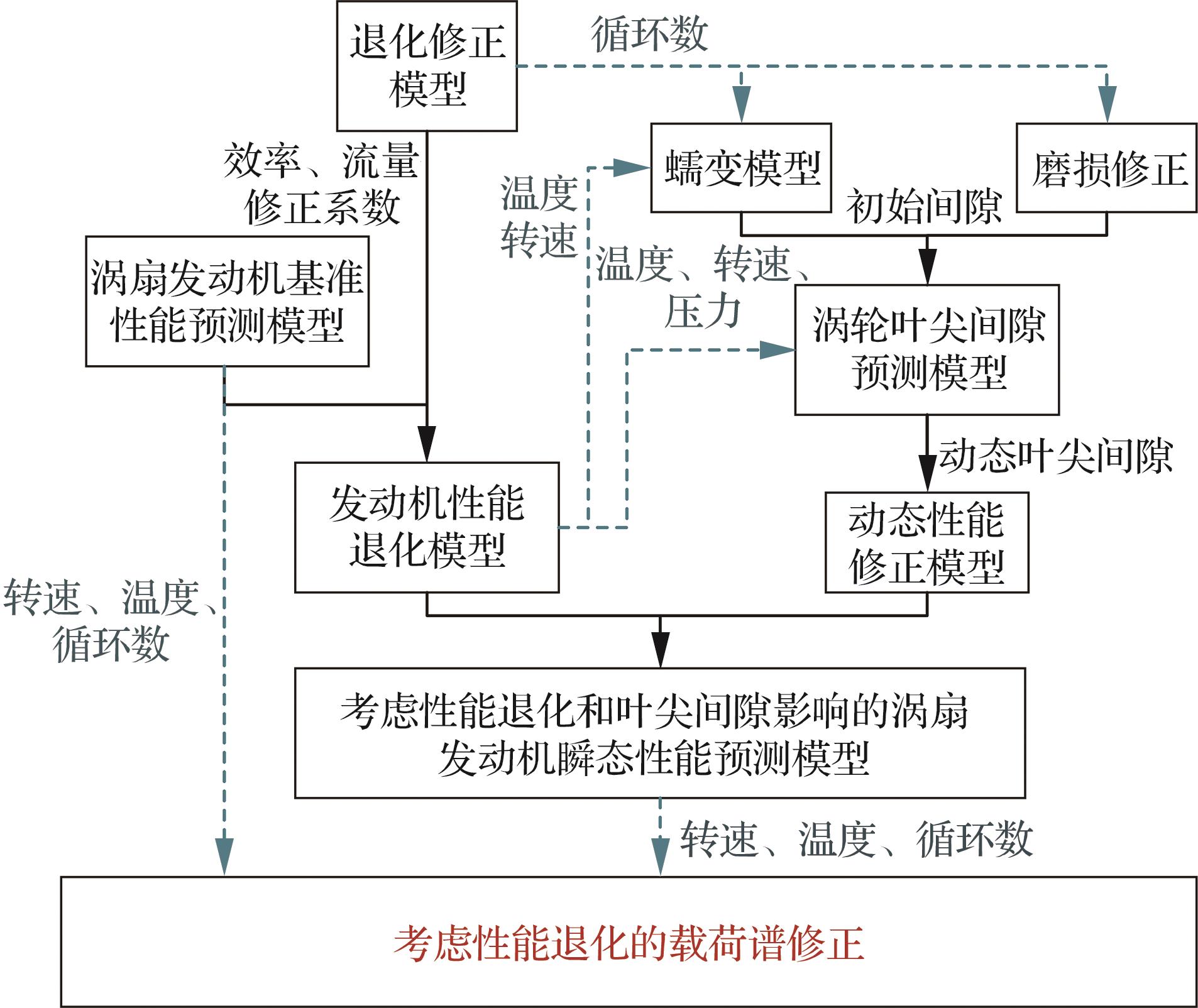 Engine performance degradation often causes changes of performance parameters, which leads to the change of load spectrum in completing the same mission and affects life prediction of the engine structure. At present, the above factors have not been considered in the process of compiling the load spectrum of the whole machine life test, resulting in a large error between life prediction results and field test results. To address this problem, based on the construction of a turbofan engine model that integrates overall performance degradation and dynamic performance correction is constructed, mainly analyzing dynamic correction of engine performance by tip clearance prediction method considering wear and creep. On this basis, a load spectrum correction method for turbofan engine considering performance degradation is proposed. The engine load spectrum for the typical flight mission profile is calculated. The results show that after 3 000 cycles of engine operation, the inlet temperature of the high-pressure turbine corrected with the model proposed in this paper is 0.69% higher than that with the traditional model. Compared with the original spectrum, the corrected load spectrum has a 4.90% reduction in the high-pressure shaft speed at the maximum state, a 2.95% increase in inlet temperature of the high-pressure turbine, and a 21.05% increase in duration of the maximum state. The goal of load spectrum correction considering performance degradation is shown to be achieved.
