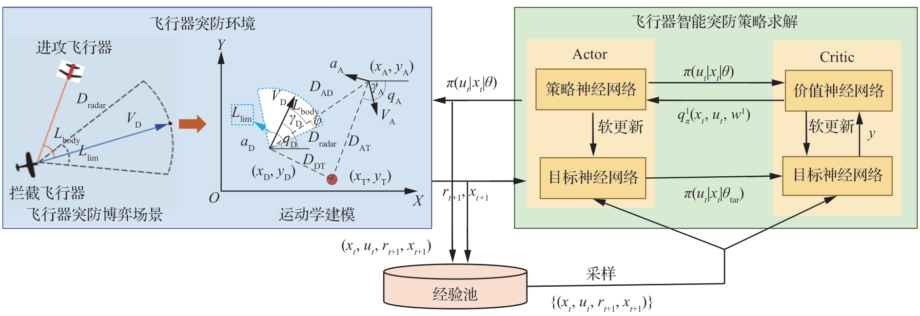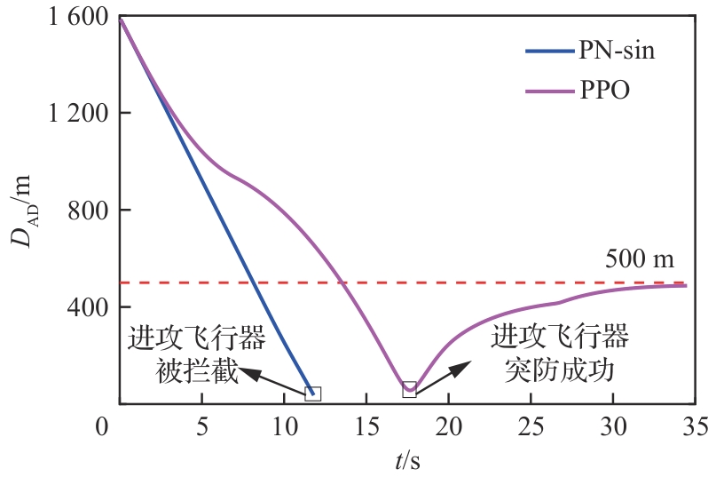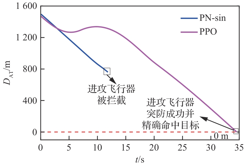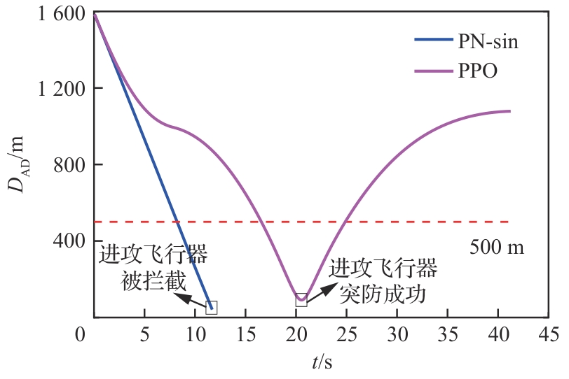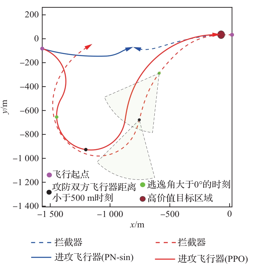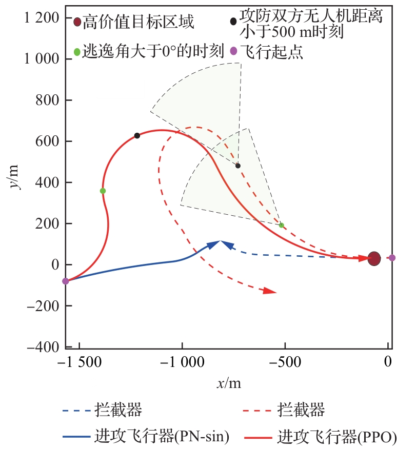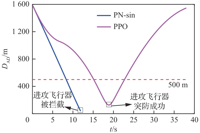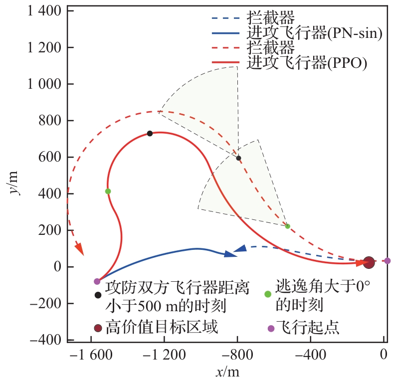 Key words: aircraft penetration game and countermeasures, proximal policy optimization, interceptor detection capability limitations, deep reinforcement learning, integrated penetration and guidance