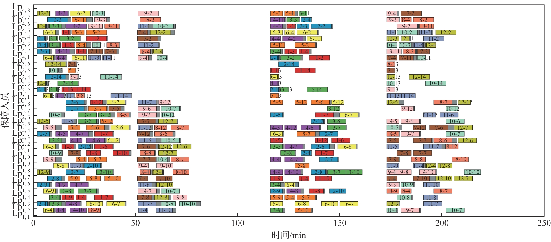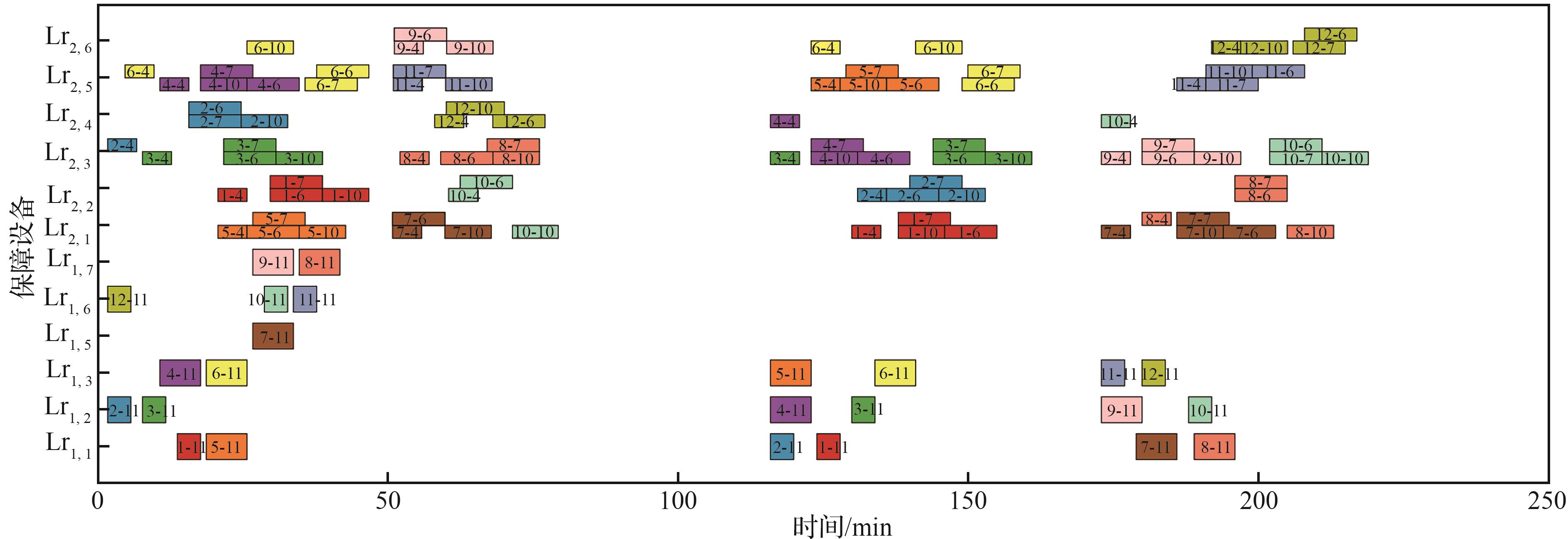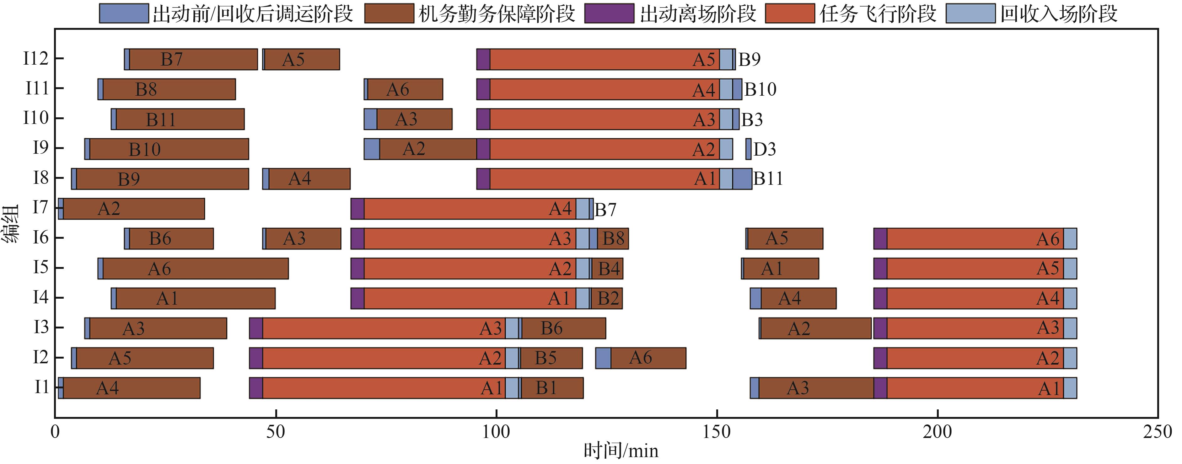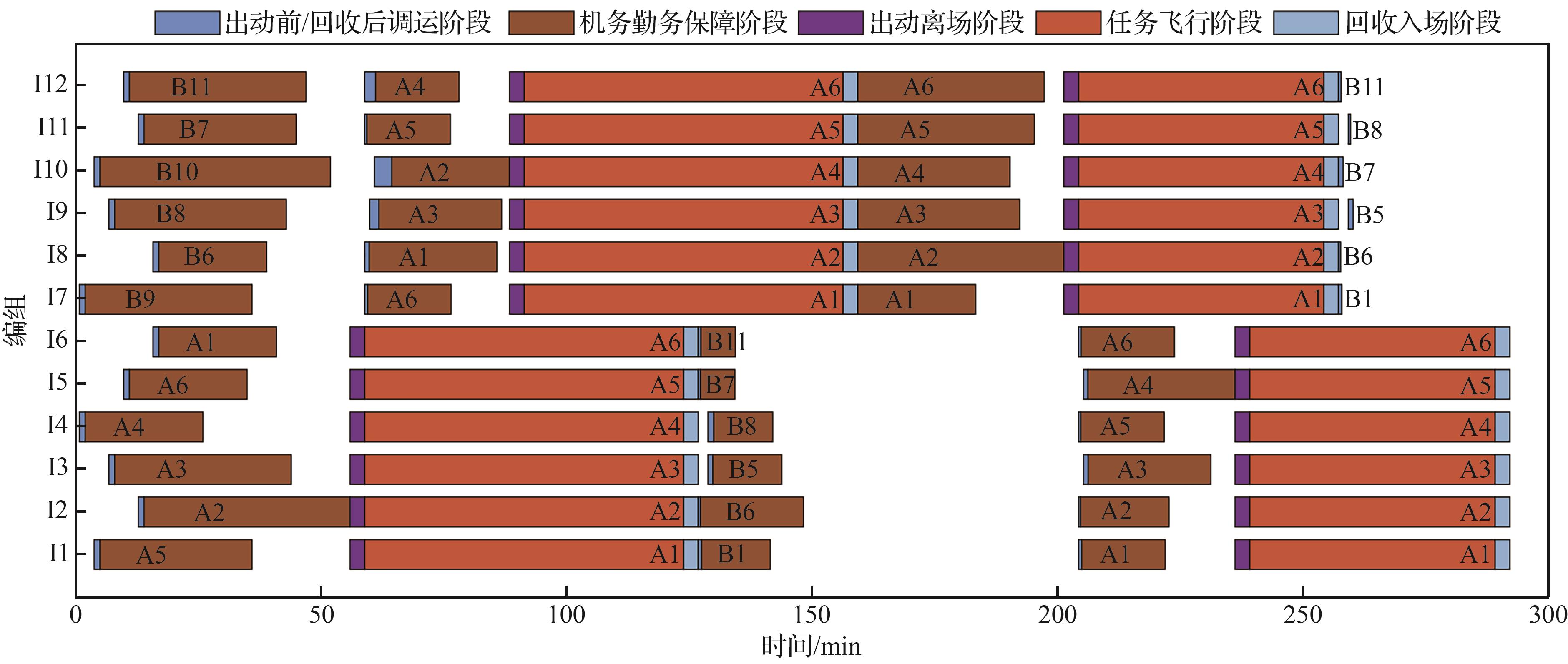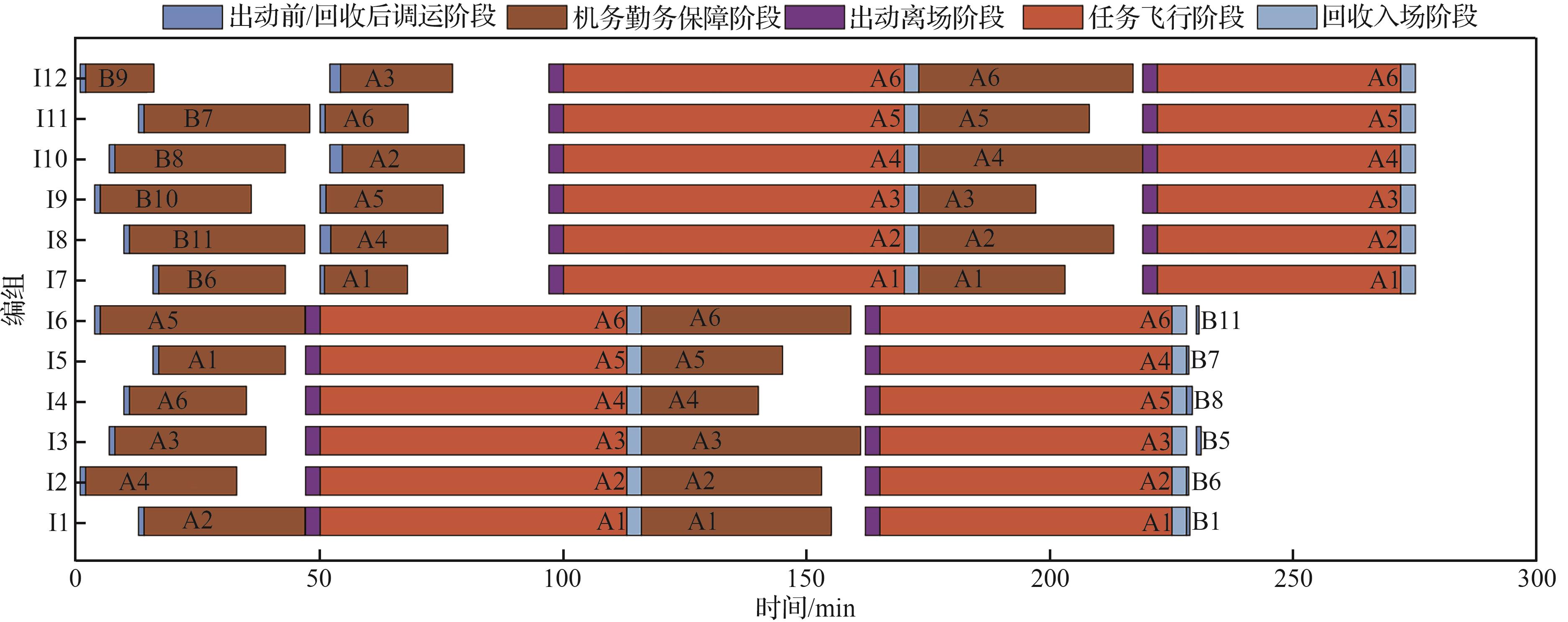 | 任务编组数量 | 编组内直升机数量 | 波次数量 | 算法单次求解时间/s | 编组平均甲板作业时间/min | 编组最短任务飞行时间/min |