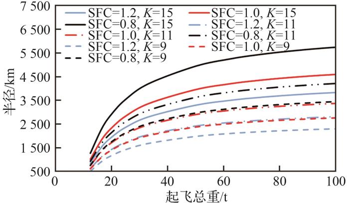 不同K和SFC组合下飞机重量随半径变化趋势