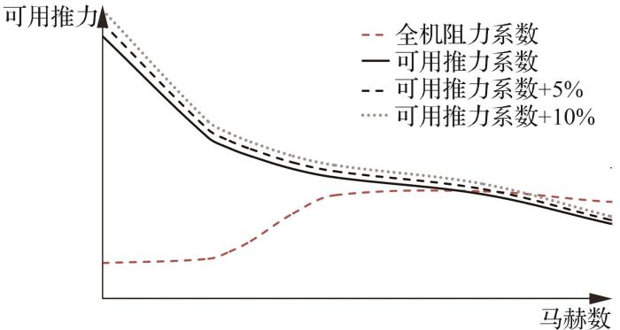 以F-22为代表的第四代战斗机的超声速巡航是推阻优化设计的典型用例,但由于隐身要求带来的主战武器内埋、远程所需的高载油系数,以及高机动性带来的低翼载要求,导致飞机最大横截面积居高不下。因此全机气动力、进气效应和排气效应等任一单项因素的设计偏差偏离预期,均可能导致超声速巡航能力无法实现。如图4的算例所示,增加5%的全机可用推力就能使平衡马赫数得到可观的增长。因此,通过推阻最优设计,能够在飞/发双方均已处于相对极限的设计状态下,进一步提高全机超声速巡航的使用空间。