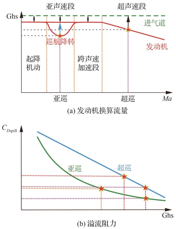 4) 超声速巡航与大马赫数状态:战斗机进入超声速飞行状态,发动机换算转速与换算流量均降低,进气道的溢流阻力显著增大,可占全机零阻的5%~7%。