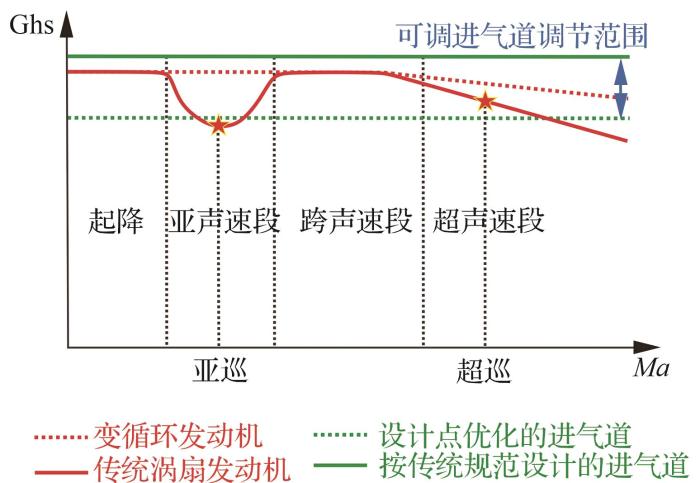 定几何进气道的设计往往以满足发动机飞行包线内最大流量需求为首要前提,因此在发动机装机后,几个典型状态表现出不同特征: