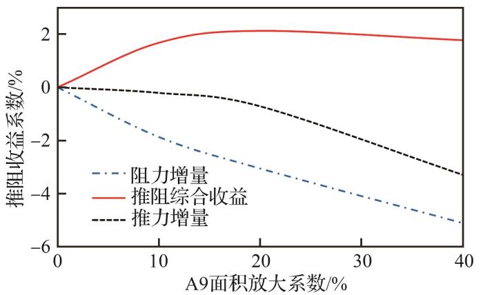 典型超巡点(标准大气条件,飞机高度11 km、马赫数1.5,发动机中间状态)的计算结果表明,开展飞机后体阻力/发动机气动综合设计可获得可观的推/阻综合设计收益,如图11所示。