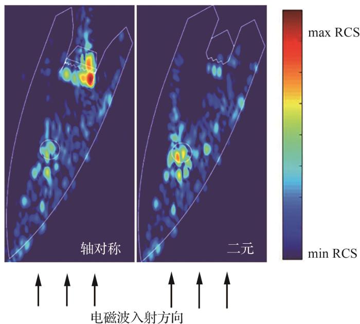 飞机进气道管道和发动机风扇组成的进气道腔体,是战斗机前向的强散射源。单纯追求进气效率和总压恢复性能的直管进气道会使机头方向产生很强的镜面回波,即便偏离正向的入射波也将因腔体效应在很宽的范围内产生较强的回波。合理的管道设计及与之相配合的电磁波吸收措施是实现其低散射的关键。