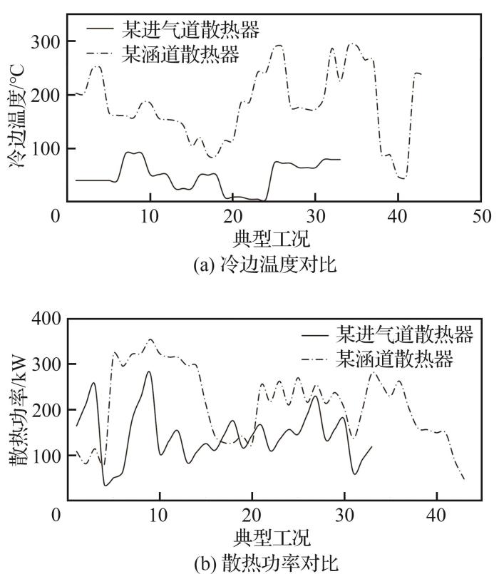 如图37所示,从涵道空气散热器和进气道散热器的冷边温度、效率、散热功率对比可知,机载热管理系统利用发动机涵道空气作为热沉是可行的,进而可减小散热器的重量体积,有利于减少战机燃油消耗,提升机动性。