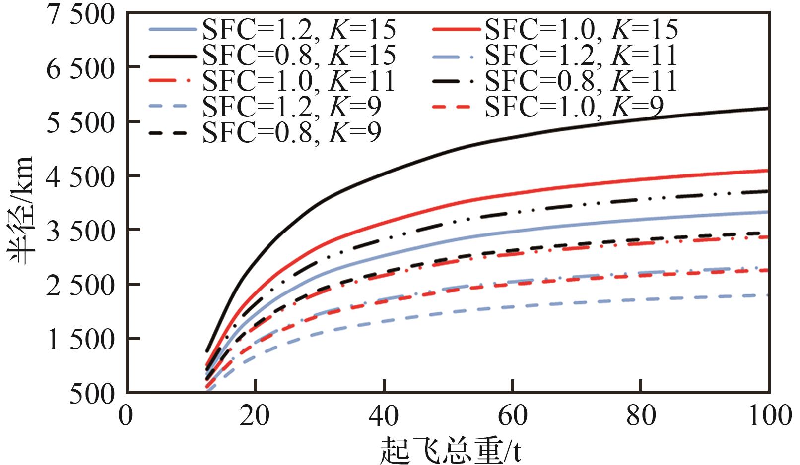 | 图2 不同K和SFC组合下飞机重量随半径变化趋势 |